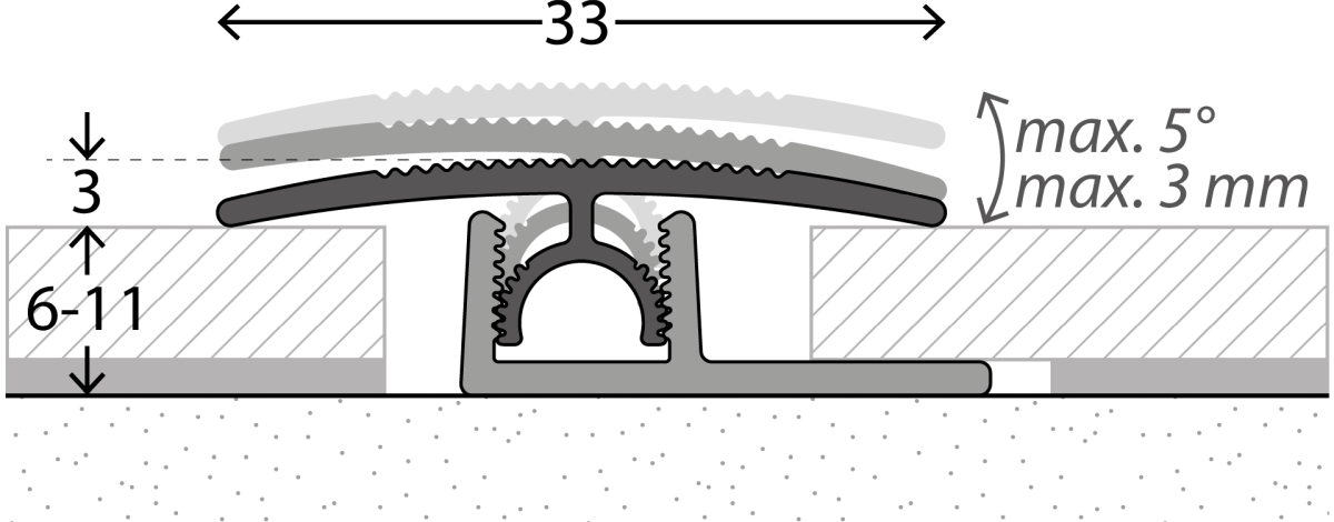 Das Aluminium - Clipsprofilsystem ist konstruiert für Belagstärken von 6 bis 13 mm. Mit dem Erhöhungsblock können sie sogar Belagsstärken bis 18mm abdecken.