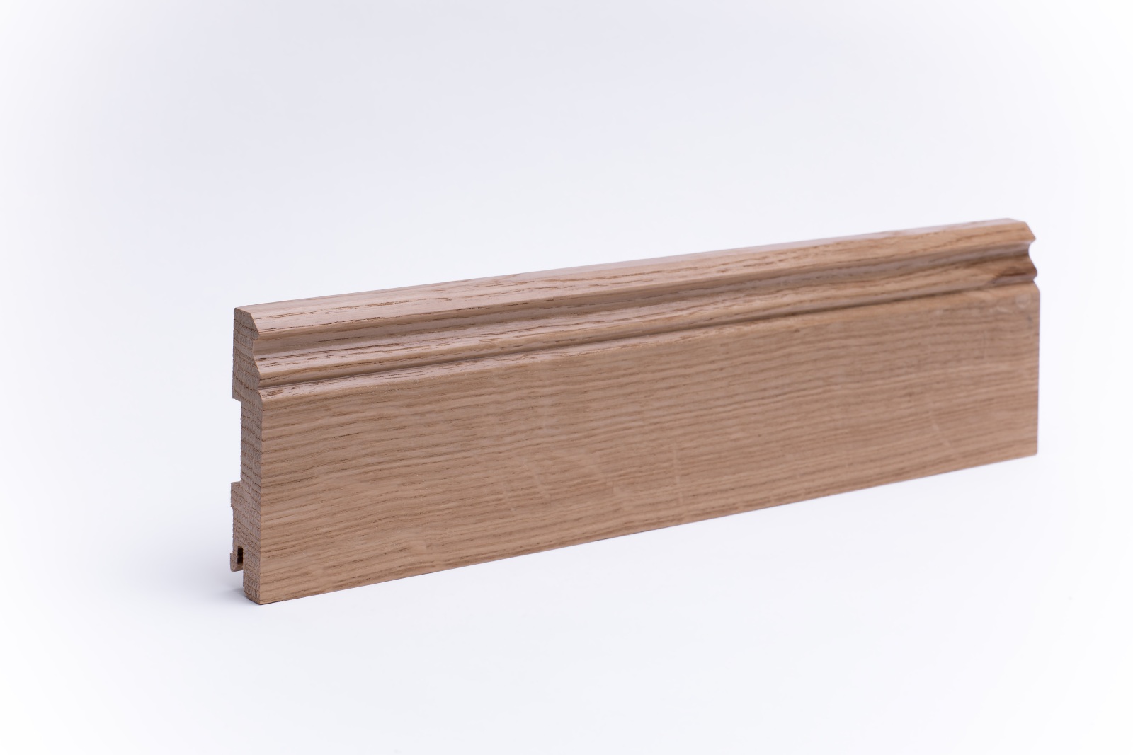 120 mm hohe Sockelleiste aus massivem Eichenholz mit Berliner Profil. Gehobelt und geschliffen. Die Leisten werden aus einem Stück, wie der Stamm gewachsen ist, gearbeitet. Dadurch entsteht ein harmonisches Bild in der Holz- und Farbstruktur. Asteinschlüsse sind möglich.