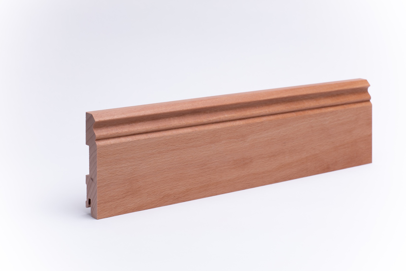 120mm hohe Sockelleiste aus massivem Buchenholz als Berliner Profil mit geölter Oberfläche. Die Leisten werden aus einem Stück, wie der Stamm gewachsen ist, gearbeitet. Asteinschlüsse sind möglich.