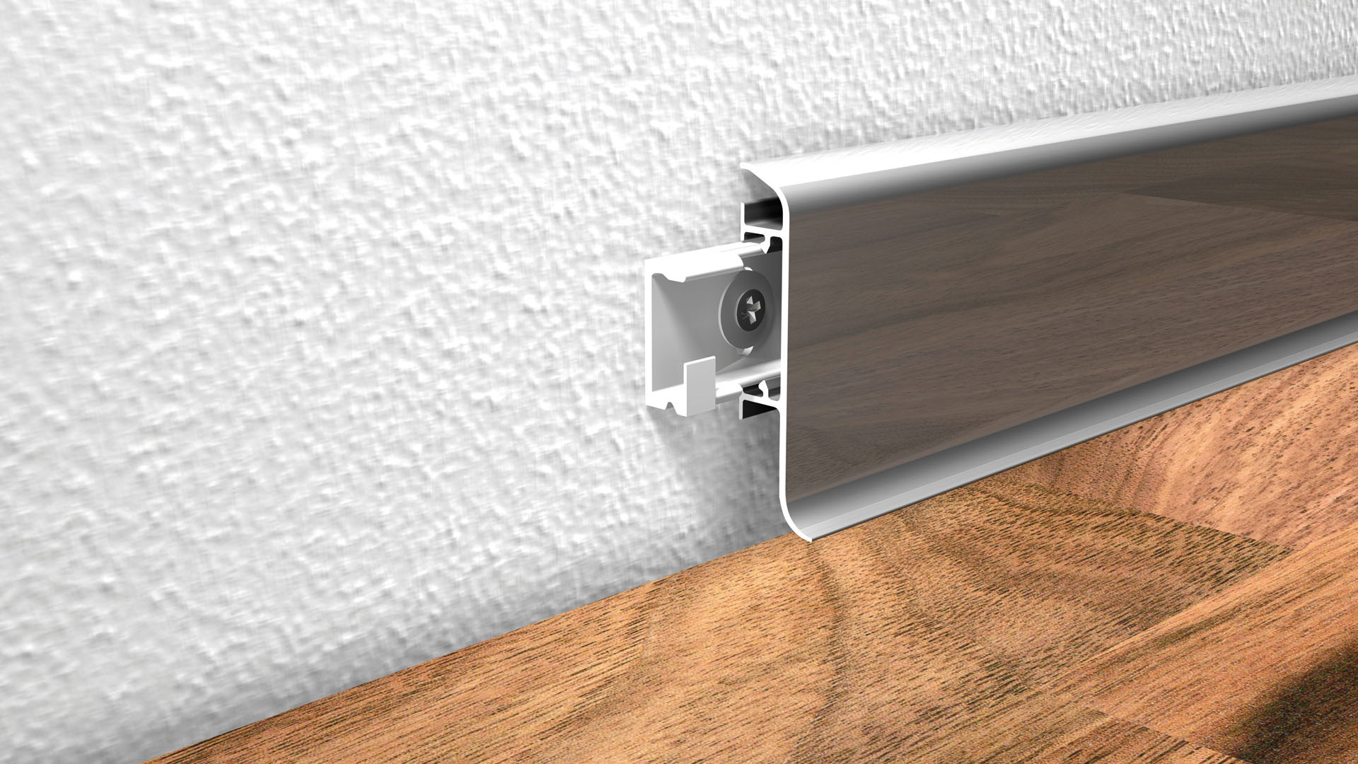 Die Sockelleiste wird durch ein Clipsystem befestigt, mit der Möglichkeit der unsichtbaren Kabelverlegung hinter der Leiste.