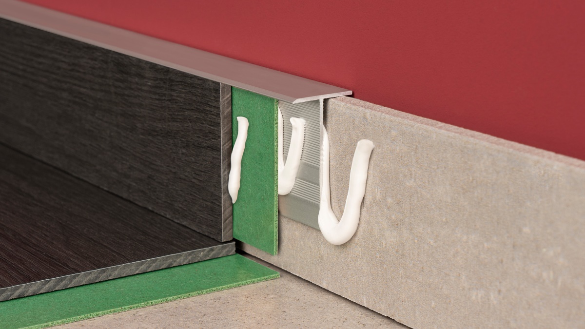 Sollte Die Tiefe des Sockels weniger als 11mm betragen, sollte die Leiste dementsprechend unterfüttert werden. Aus dem Bodenbelag werden dann Streifen in der Höhe des Fliesensockels eingeklebt.