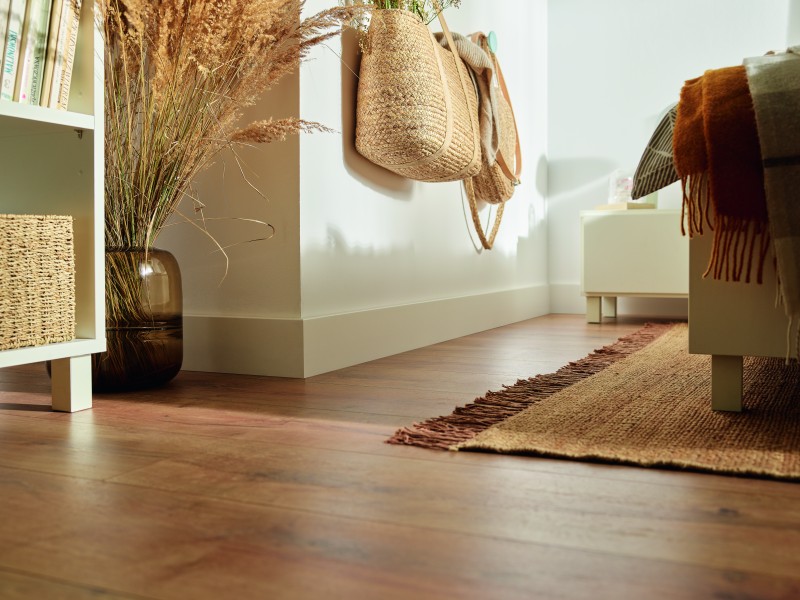 Die extrem robuste und hochwertige Espumo-Sockelleiste wird mit einer speziell dafür entwickelten Kerracore-Technologie hergestellt. Die Leiste besteht aus einem Polymermaterial, das mit mineralischen Zusätzen veredelt wird. Eine leichte, geschäumte Innenschicht und die harte Außenschicht machen die Leiste feuchtigkeitsbeständig und stoßfest, wodurch diese nahezu überall einsetzbar ist. Das Material, aus dem die Espumo-Sockelleiste gefertigt ist, nimmt weder Feuchtigkeit aus dem Raum, noch aus den Wänden oder Böden auf. So verzieht sie sich nicht und ist auch ideal für Neubauten geeignet, bei denen die Wände noch einige Zeit Feuchtigkeit abgeben.