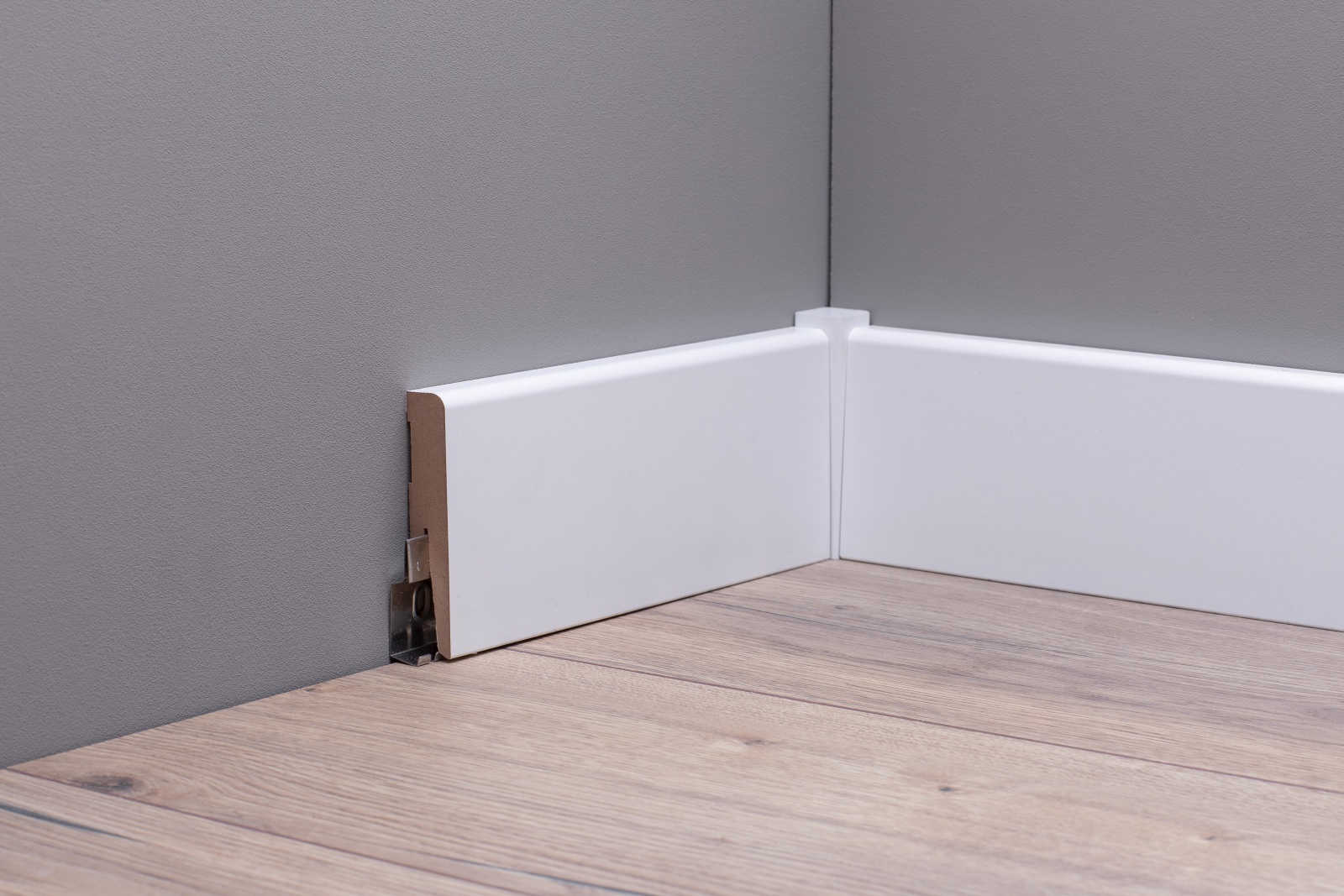 Die Fußleiste hat einen MDF-Kern (MDF-mitteldichte Holzfaserplatte). Dieser gibt der Fußleiste ausreichend Flexibilität sowie Stabilität.