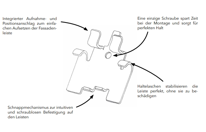 Inhalt: 100 Stück Fassadenverbinder inkl. Systemschraube mit integrierter Bohrspitze (ausreichend für ca. 4 m² - je nach Höhe der Fassadenleiste).