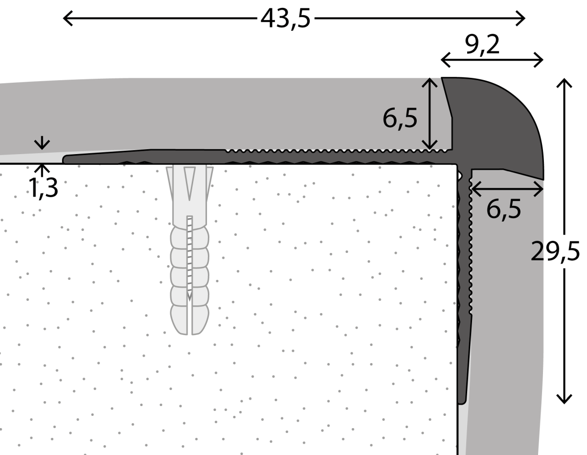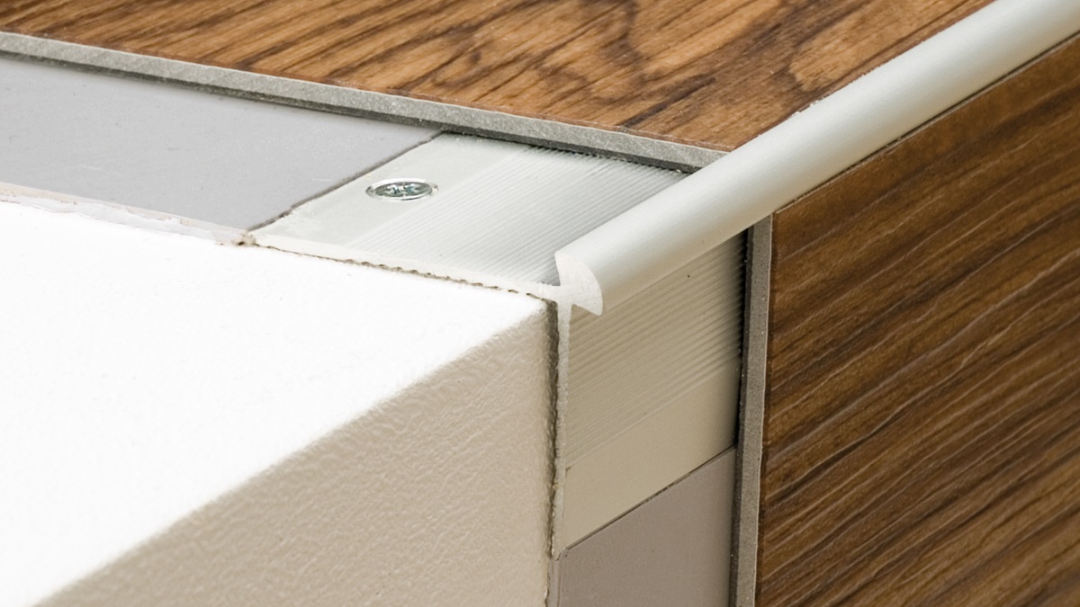 Treppenkantenprofil für Designbeläge von 6 bis 6,5 mm, für die vollflächige Verlegung von Designbelägen auf Treppenstufen. Die darauf abgestimmten Profile schützen die Kanten des Belags.