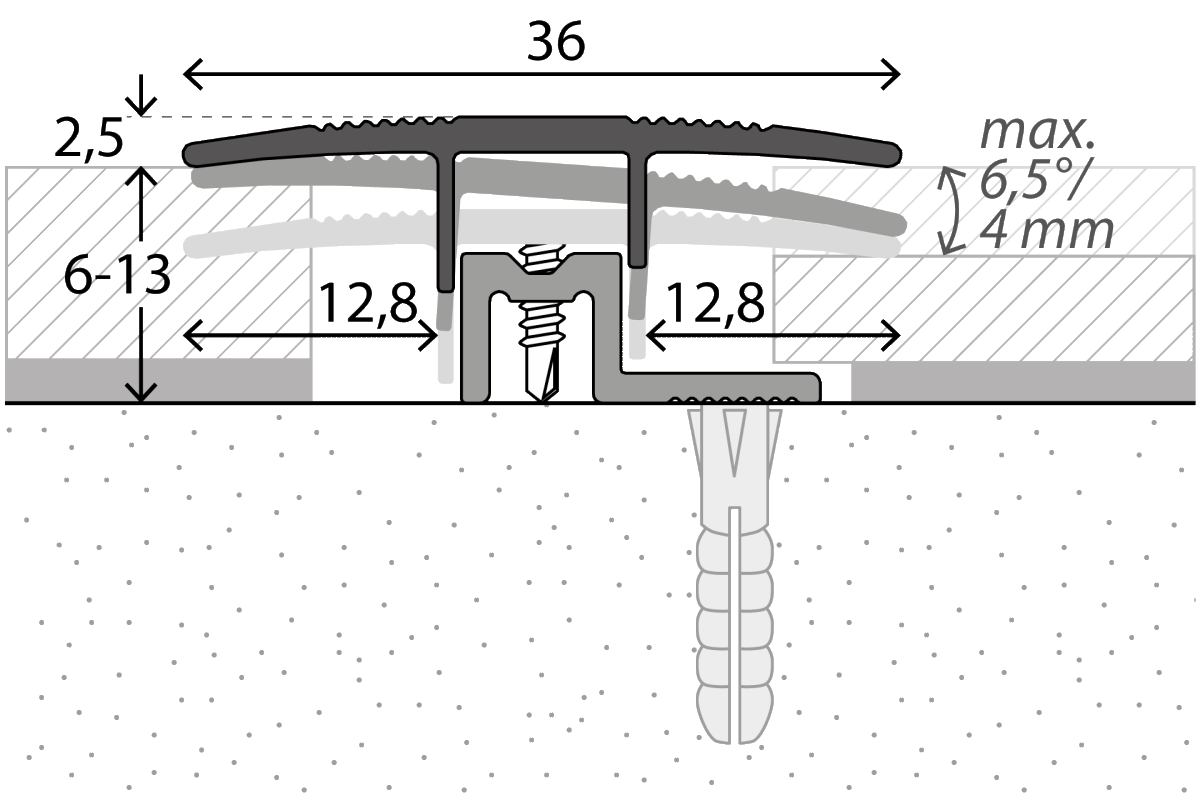 Die Montage ist besonders schnell und einfach. Das Aluminium - Basisprofil wird auf den Untergrund befestigt und der Bodenbelag verlegt. Das Oberprofil wird mit den beiliegenden selbstschneidenden Bohrschrauben auf dem Unterprofil befestigt. Das Oberprofil passt sich dabei stufenlos dem Bodenbelag an und schließt automatisch an beiden Seiten dicht ab. Durch den Einsatz der Selbstbohrschraube, erhalten Sie ein Profilsystem mit optimalen Kraftschluss, auch nach mehrjähriger Druck- und Zubelastung und ist damit für höchste Belastung geeignet.